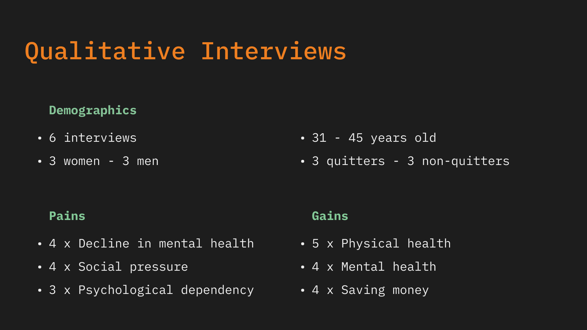 We conducted a comprehensive analysis of our interview transcripts and survey responses, consolidating all valuable quotes and insights into a cohesive collection. After organizing the data into distinct clusters, we identified four primary themes: 'Helpful during Quitting,' 'Motivators,' 'Struggles,' and 'App Features.' Utilizing the dot voting method, we determined to prioritize the themes 'Helpful during Quitting' and 'Struggles' as we move forward with our design process.
